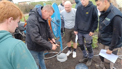 Na de theorie over de aanleg en onderhoud van het drainagesysteem zijn de deelnemers met een opdracht naar een nabijgelegen kwekerijperceel gegaan om in tekening aan te geven hoe het drainagesysteem was aangelegd. Vervolgens werd een demonstratie van doorspuiten van een drainagebuis gegeven. Het tweede deel van het programma ging over de grondbewerking waarbij is ingegaan op diverse machines, die binnen de boomkwekerij worden gebruikt, zowel via filmpjes als de aanwezige machines op het bedrijf. Naast de werkwijze en werking van de machines kwam hier ook het dagelijks onderhoud aan bod.